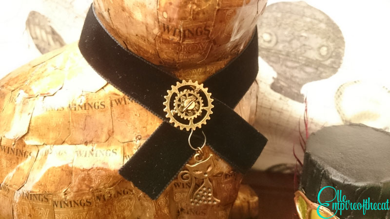 Neckwear – black velvet ribbon and tie pin made from cogs, jewellery wire, metal cat charm
