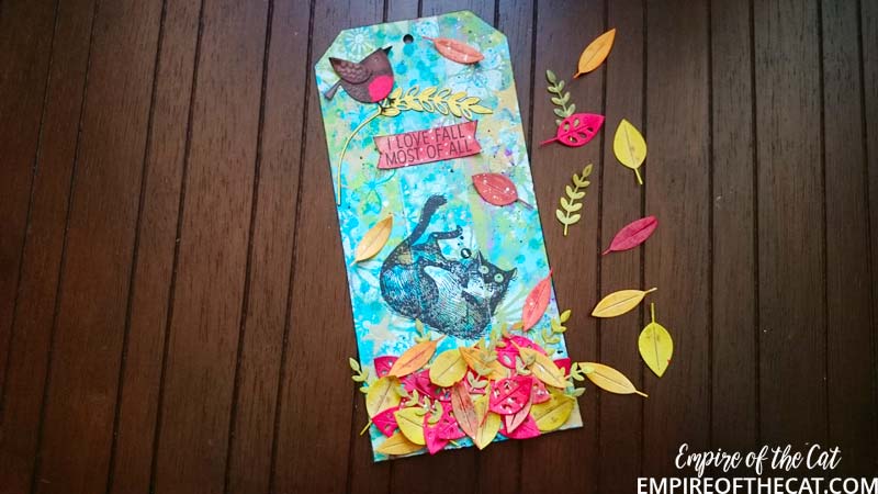 leftover strips of masterboard, amazon box to make tag, leftover leaves and bird cut from several different dies, Halloween Snarky Cats stamp, black archival ink, acrylic paint splatters, Distress inks on the die cuts