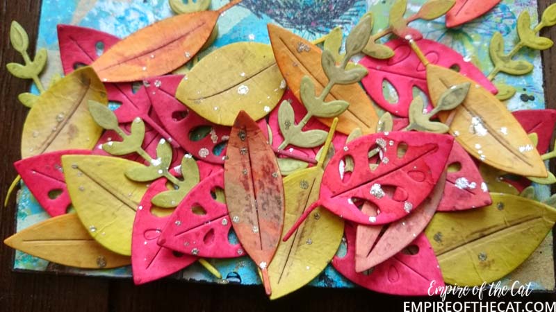 I also used that amazon box in the above photo as the base for my tag, and glued the acrylic painted strips on top and then cut off the top corners and punched out a hole to make it more tag-like.  I do love a bit of recycling!  Speaking of which, when I was tidying up, I found all these little leaves and bits and pieces that were stored in a box since at least last Autumn.  They were all cut out on the big shot and coloured with Distress inks.  There are several dies from several different brands including Sizzix, MFT, Concord & 9th and Waffle Flower.