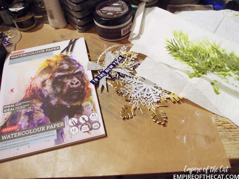 I cut out all the bits and pieces using glitter card stock and metallic card stock. Here’s a tip: if you don’t have the exact colour you want in glitter card, but you do have something light like white or silver, just colour it in with alcohol markers. I *do* have green glitter card but not the shade I was after, so I used some markers to colour in some of the silver card. Now that you know this trick, you might decide to only buy white or silver glitter card from now on and make your own custom coloured card stock every time! I also found this pad of A5 watercolour paper so I decided to use it and make a large card. (approx 2x the size of US A2 cards)