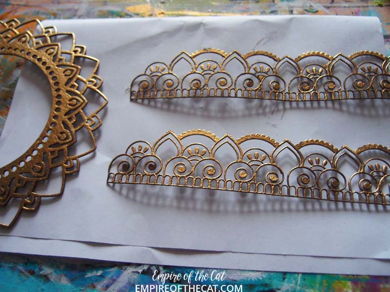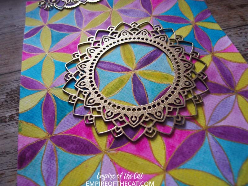 I wanted to use some metallic elements on my page and so I pulled out these chipboard pieces – Henna Border D117C x 2 and Mandala Frame 2 C58P.  Note the Mandala Frame has two pieces but I am only using the front piece since this is a journal page and I don’t want too much bulk should I decide to keep it in my book rather than on display.